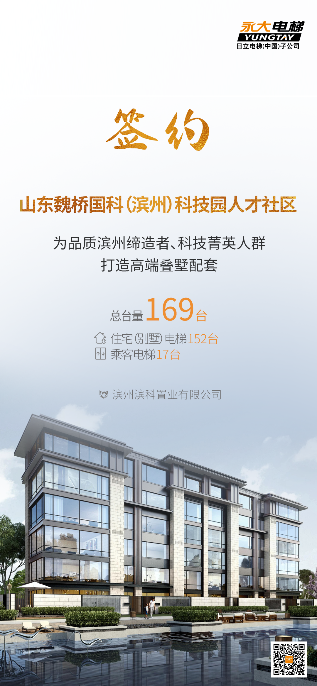 永大電梯以科技之力,藝術之美,讓墅居生活從容有度。為科技園人才社區打造智慧流暢的出行體驗,助力濱州科技發展和城市騰飛之夢。